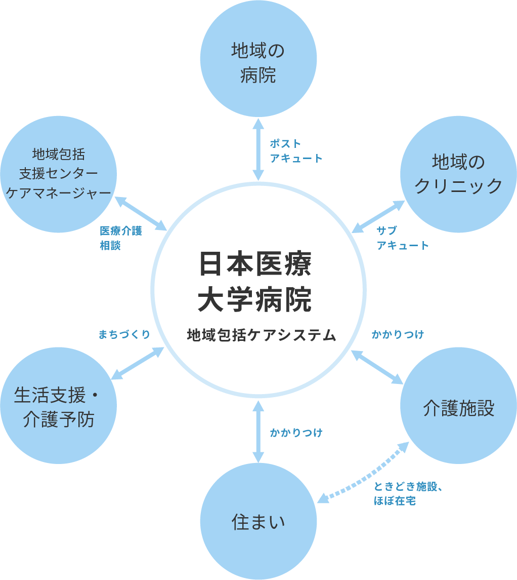 日本医療大学病院は、地域の医療・介護機関と協力して住み良いインフラを構築し、お一人ひとりがしあわせに暮らしていくための地域包括ケアシステムの推進に取り組みます。
